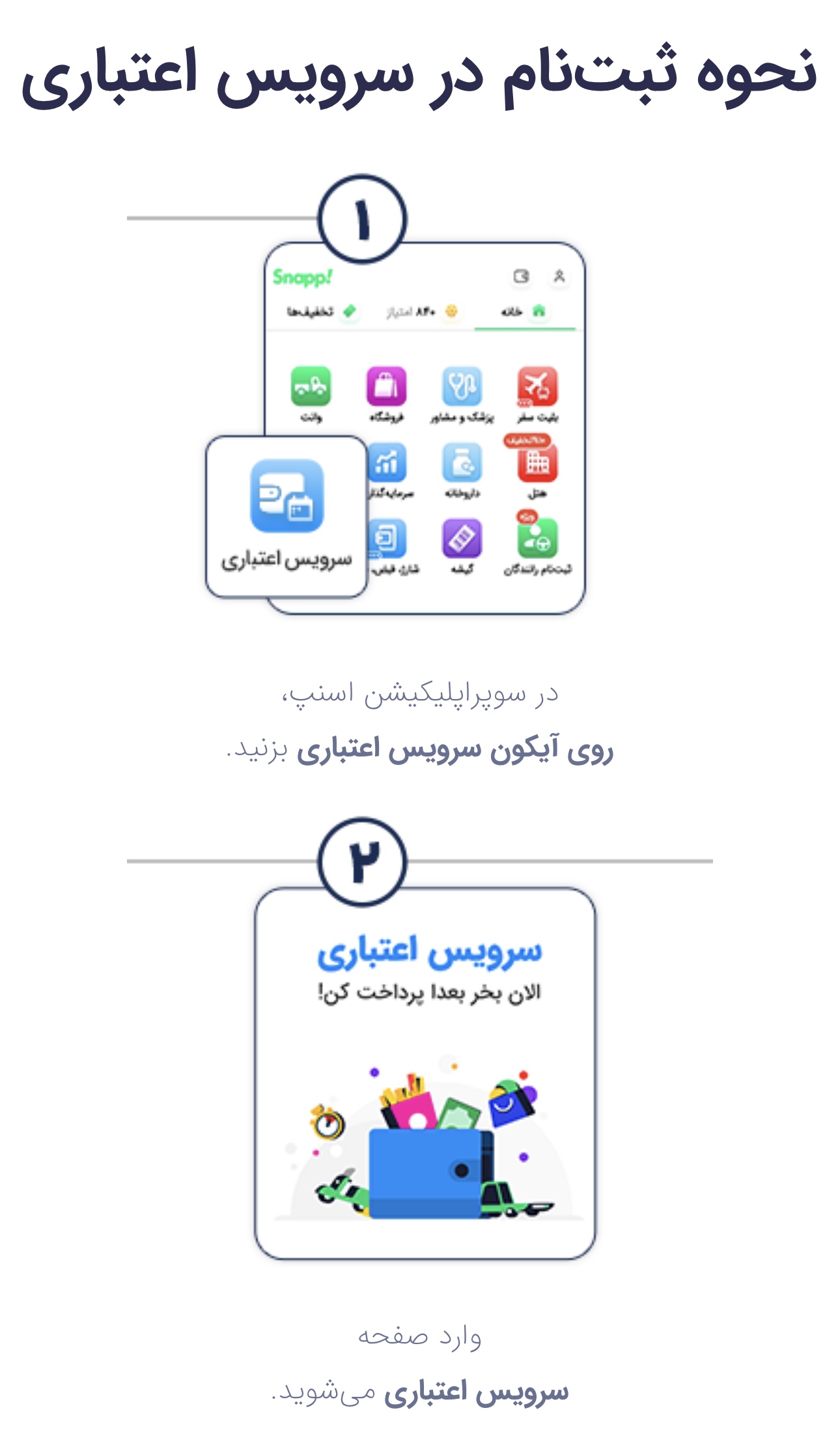 ✅ برای فعال سازی اسنپ پی وارد اپلیکیشن اسنپ بشین و روی گزینه “سرویس اعتباری“ بزنین.